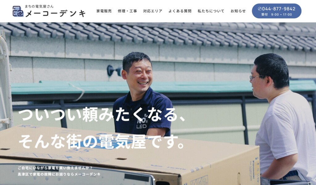 川崎市で家電修理や家電販売を行う「メーコーデンキ」様。 現在、「高津区 電気屋」という言葉で検索すると、1位(※2026年2月時点)に表示されます。